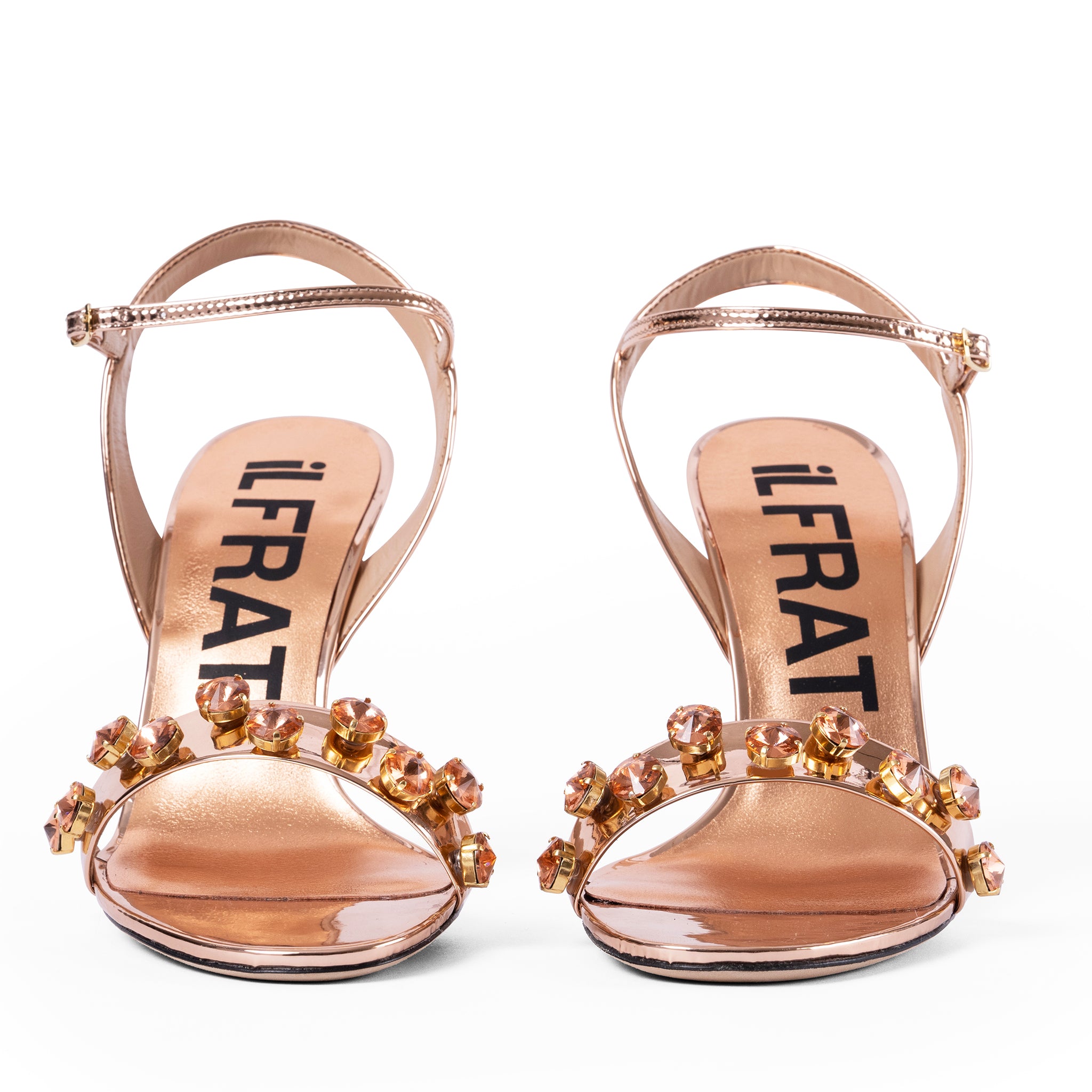Italian mirrored leather. Italian crystal embellishment. Supple goat leather lining and natural leather sole with embossed detail.