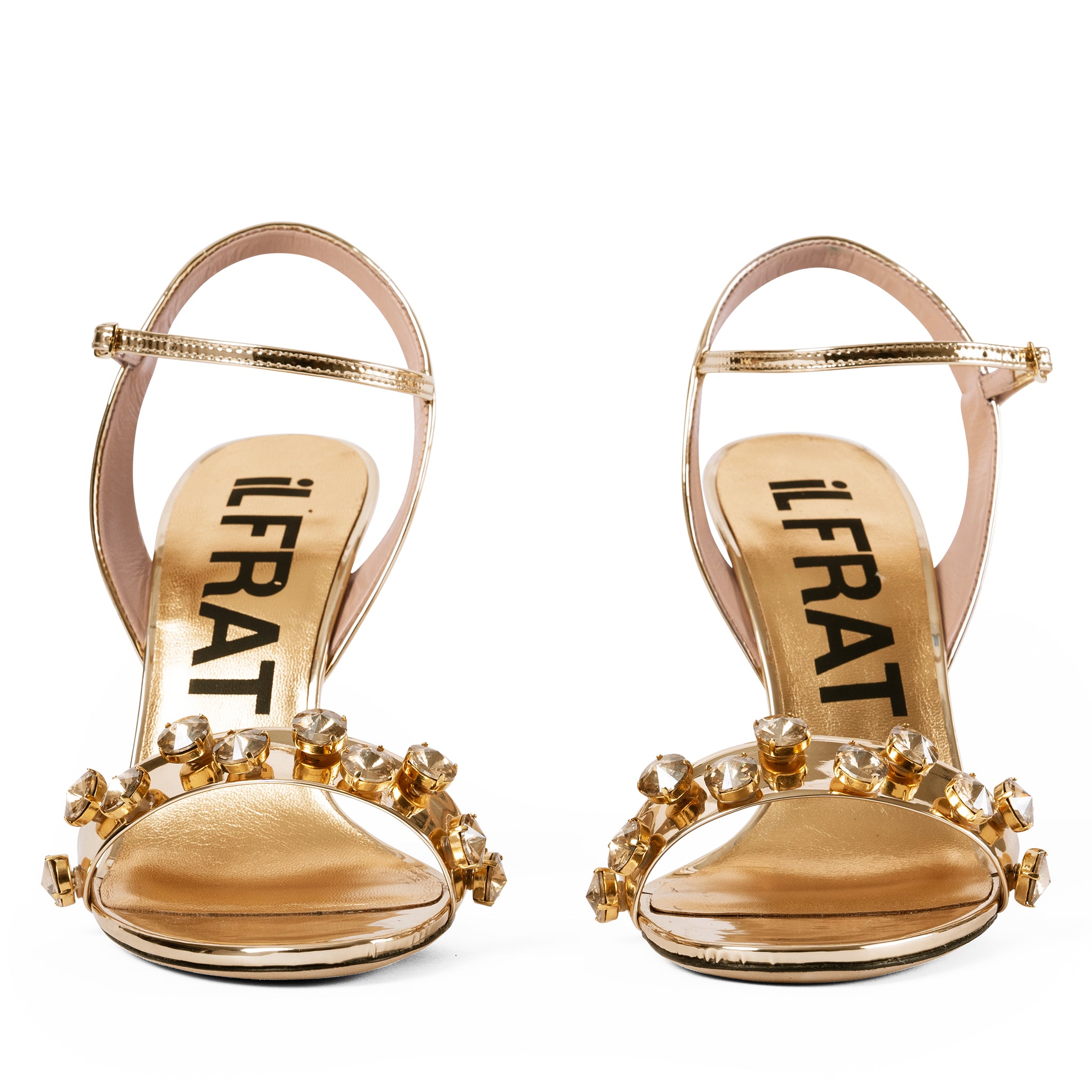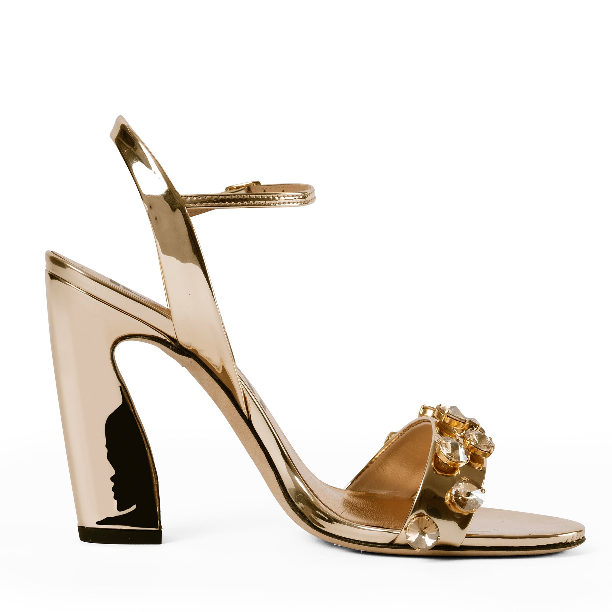 Italian mirrored leather. Italian crystal embellishment. Supple goat leather lining and natural leather sole with embossed detail.